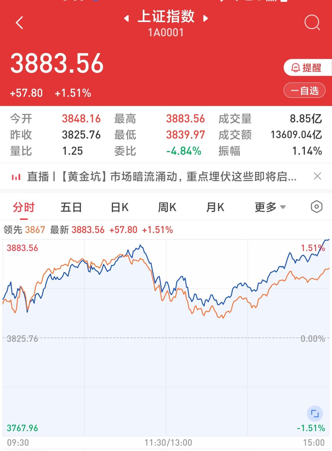 截至收盘,上证指数放量大涨1.51%,报3883.56点;深指涨2.26%;创业板指涨3%。此外,北证50涨幅为0.23%,科创50飙涨3.2%。