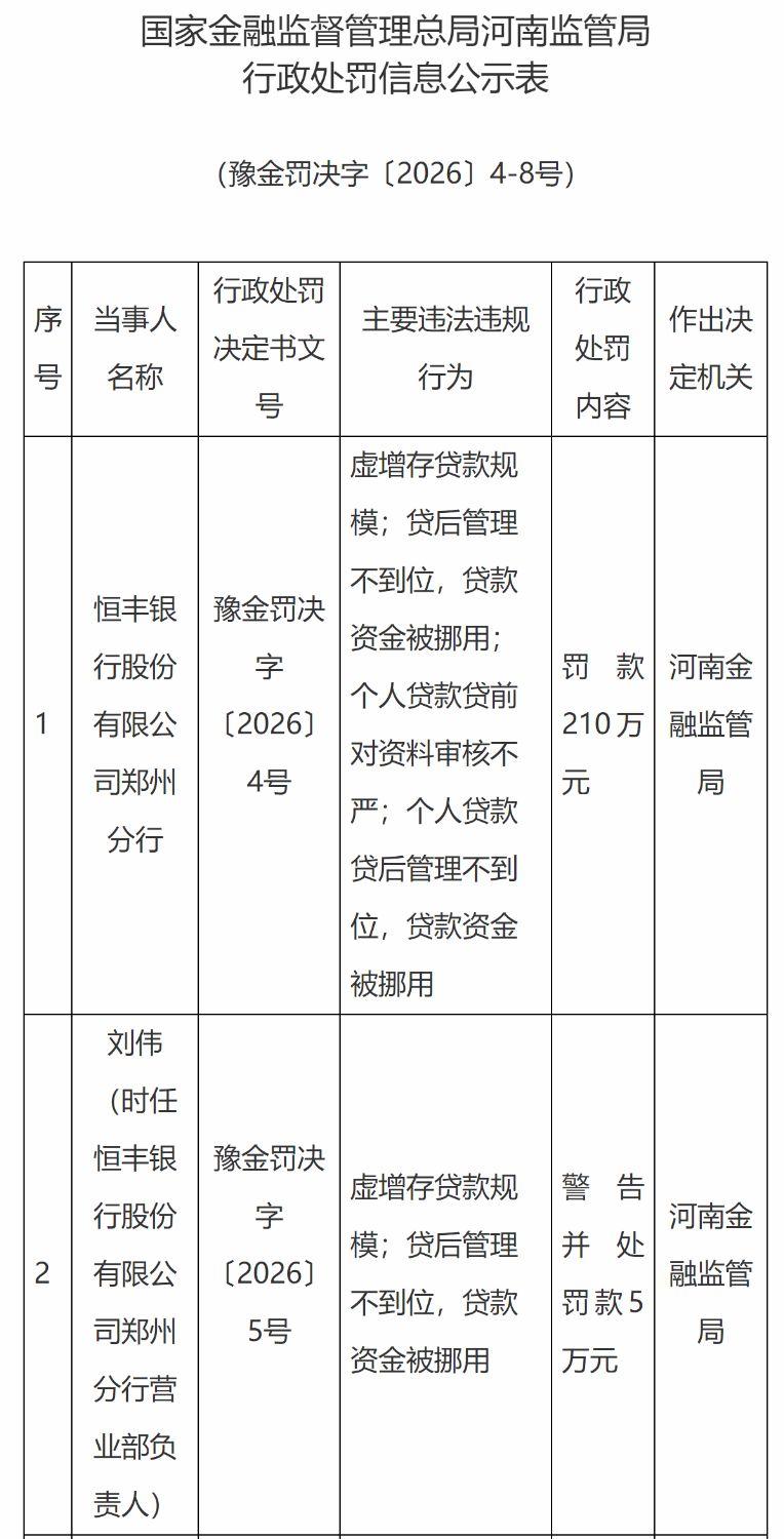 目前,“双罚制”(即同时处罚机构和相关责任人员)已成为监管标配。今年前两个月的罚单显示,几乎所有涉及虚增存贷款的案例都对责任人员进行了追责。不过,处罚形式仍多以“警告”为主,这属于个人行政处罚中力度相对较轻的类别。例如,在恒丰银行郑州分行被罚款210万元的案件中,四名相关责任人分别被处以5万元罚款及警告。